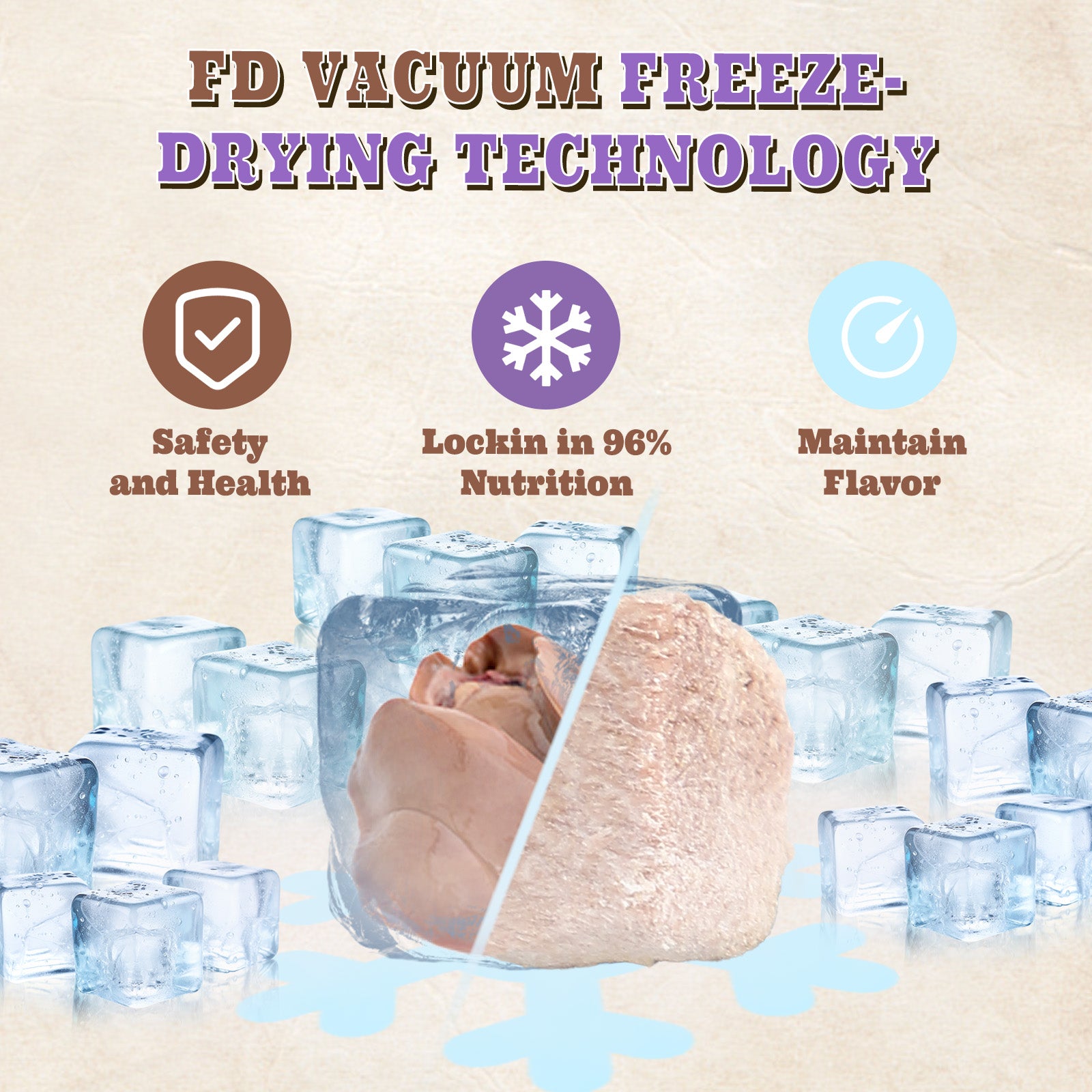 - 96% Nutrient Retention: Using advanced freeze-drying methods, this gentle process locks in 96% of the original nutrients—including vital vitamins, minerals, and amino acids—supporting your pet’s overall health and vitality.
